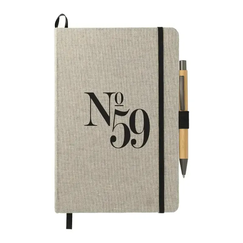 The 5.5" x 8.5" Recycled Cotton Bound JournalBook® Set includes (2800-94) 5.5" x 8.5" Recycled Cotton Bound JournalBook® and (1066-49) Bamboo Quick-Dry Gel Ballpoint. The 5.5" x 8.5" Recycled Cotton Bound JournalBook® is the perfect journal for all of your notetaking needs. Features a recycled cotton, hard cover. Natural color elastic closure, pen loop and ribbon page marker. 80 sheets of FSC® Mix cream lined paper. Back document pocket. FSC label printed inside. Through a partnership with 1% For The Planet, one percent of sales of this and all EcoSmart® products are donated to environmental nonprofits.