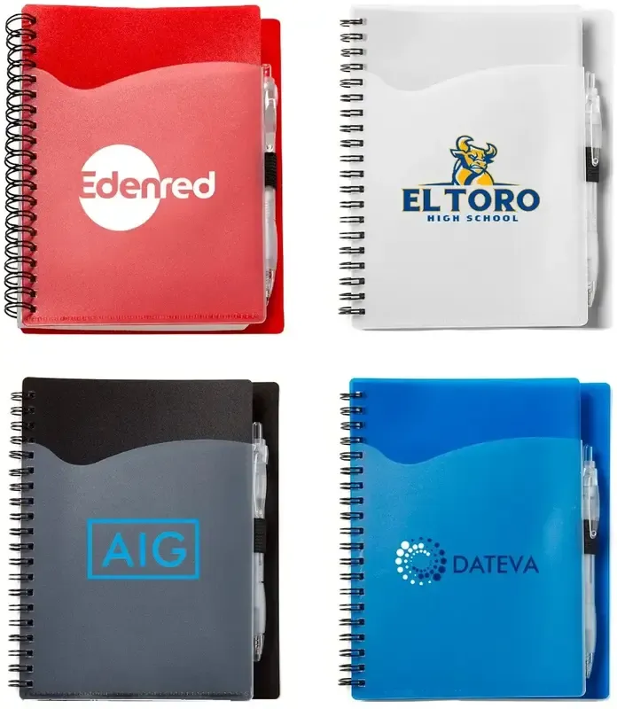 This spiral bound notebook features 70 pages of lined paper with a color cover, a clear wave style front storage pocket, an elastic pen loop and a ballpoint pen. This notebook is the perfect size for note-taking at school or work and slips easily into a purse, bookbag, or backpack. Choose from four cover colors and add your school, sports team, organizational or company logo to customize.