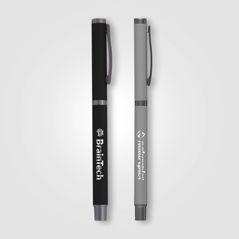 A soft-touch rubberized finish with gunmetal accents modernizes this classic, capped metal pen. The Bowie Rollerball pen delivers a smooth, fluid writing experience, and is designed to impress. Customize with a mirrored laser engraved imprint.