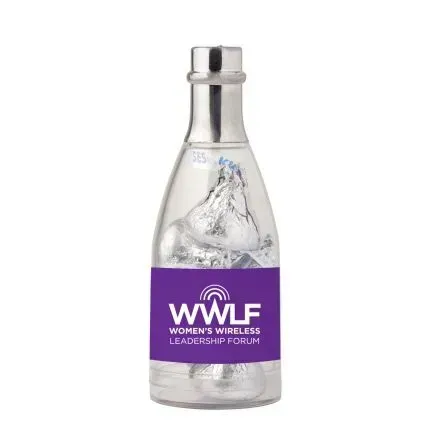 When you can't break out the bubbly, break out the candy instead! Measuring 1 1/2" x 4", this clear champagne bottle features a silver lid and is filled with 1 oz. of delicious Hershey's Chocolate Kisses! A great choice for corporate giveaways, party and wedding favors and a variety of other promotional events, each bottle can showcase a full-color imprint of your event title, company name or logo on a custom label. Raise a glass and toast to this tasty promoter!