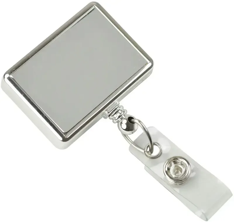 Our chrome rectangular shaped badge reel attracts more attention than standard round reels. Reels have a swivel-type belt clip on the back and come with a clear vinyl strap. Cord has a nylon core with a polyester wrap for added durability.