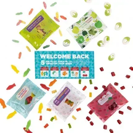 Make their first week back super sweet! Snack box comes with 5 candy bags for each day of the week. The perfect way to show a week's worth of appreciation in one gift! Our gummy candy box is filled with 5 different 2 oz. digibags of gummy candy. Box comes with sour buddies, gummy bears, assorted fish, gummy sour apple rings, cherry bites.