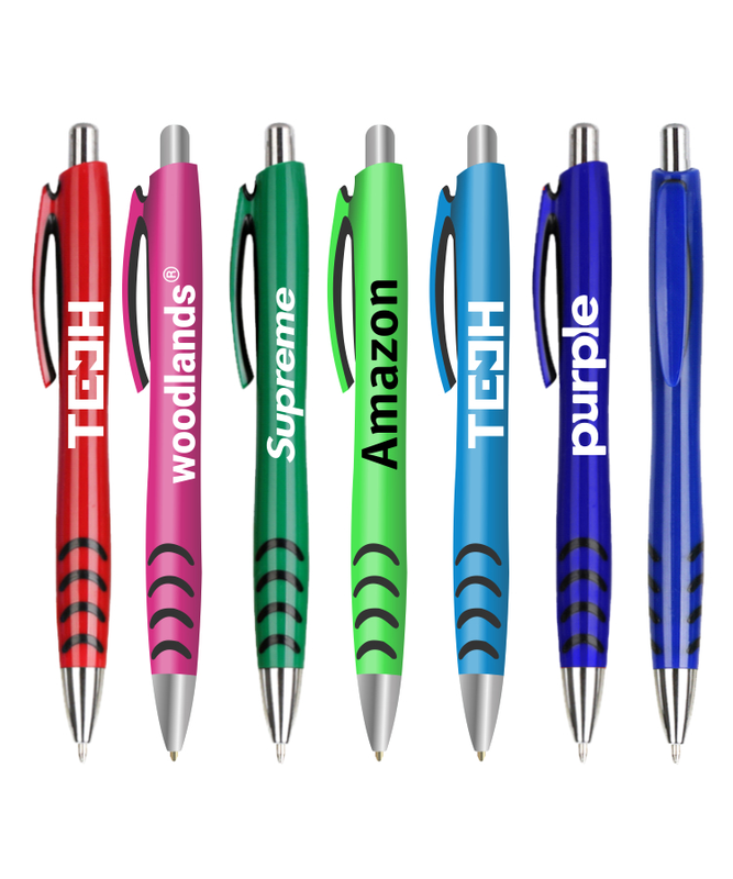 Bold retractable ballpoint pen featuring a vibrant colored barrel with a contoured rubber grip for added comfort and control. Designed with a smooth click-action mechanism, black grip accents, and polished silver tip and plunger for a sporty, modern look. The curved barrel offers generous imprint space for high-visibility branding. A popular choice for trade shows, corporate promotions, and everyday office use.