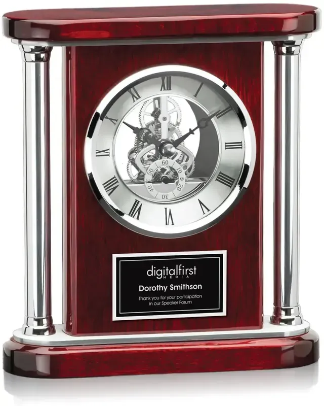 The dazzling Collins Clock, squared edge with a stunning centerpiece with gears and elegant design.