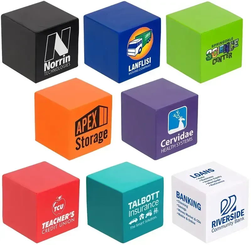 Cube Shaped Polyurethane Stress Reliever. White stress relievers may discolor over time. Please store them in their plastic bags away from direct sunlight and distribute within 3 months.