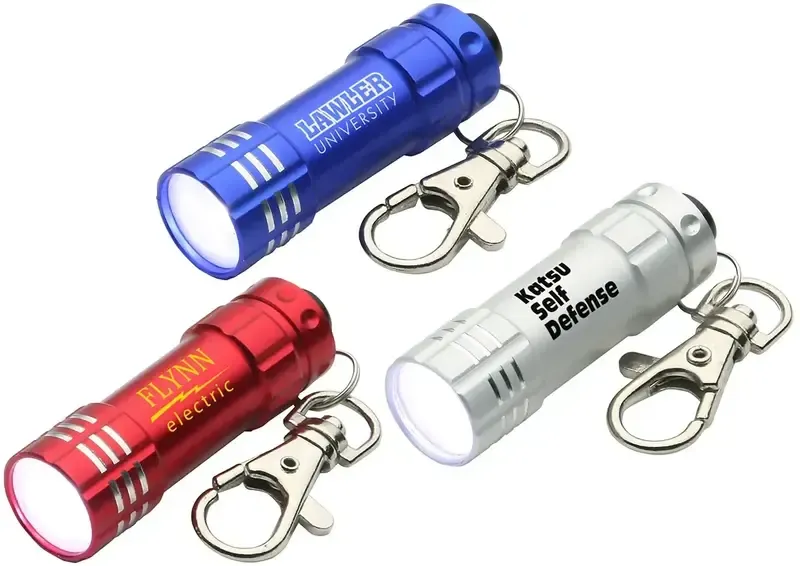 Three LED lights - Rubber tip push on/off button - Metal carabiner clip key chain - 12 Lumens - Powered by 3 AG13 button cell batteries, inserted