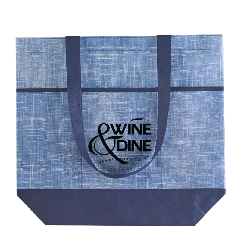 Looking for a simple yet practical item to hand out at trade shows and conventions? We have it right here! This handy tote bag with pockets is constructed of 70gsm non-woven polypropylene and features a denim look with 5" bottom gusset, 3 front pockets and 25 1/4" handles. Add a brand name, logo or marketing message to each one using one of our imprint methods. It's an easy way to get brand exposure!Please Note:1-color imprint only. min. 10 pt. type. No halftones or small details.For 2 or more colors, use Vibrant Full Color Option.