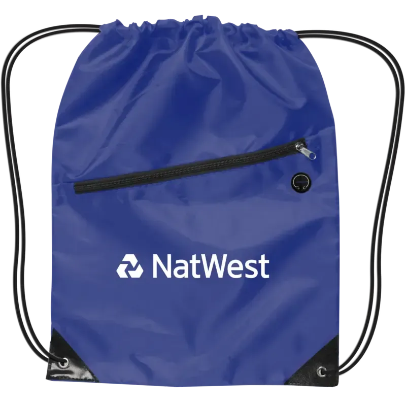 Get ready to have your brand get carried away! This drawstring backpack with zipper is a 210 denier polyester cinch bag with black adjustable drawstring closure, front zippered compartment, earbud port (earbuds not included) and black reinforced triangle corners with metal grommets. Bags are great for trade and product shows, travel, gift giveaways, sports, and so much more so feel assured to pick this item for your next promotional campaign. It measures 17" x 13", comes in several color choices, and has several imprint methods available, and 3 colors can be chosen with no charge. You will carry the show away with this backpack!Please Note:1-color imprint per position, min 10 pt. type. No halftones or small details.For 2 or more colors, use Vibrant Full Color Option.