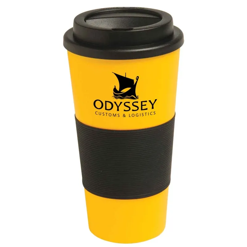 Take that cup of joe to go on your work or school commute in this easy-to-carry tumbler. This 16 ounce insulated travel tumbler is made of polypropylene with silicone grip and screw-on lid to keep your fingers cool and your java safe and secure. It's BPA free, double wall insulated, and fits in most automobile and standard cup holders. Throw it in the top rack of the dishwasher to clean, or into the microwave to reheat -- it can take it! Choose from three vibrant colors, and add your school, sports team, club, company or organizational logo to create a dynamic branded promotion.Please Note:2-color imprint on one side only, 1-color imprint on two sides