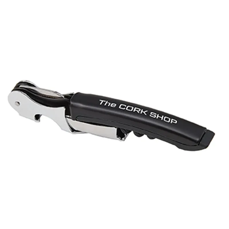Your customers who love wine will surely appreciate this promotional Sommelier Wine Opener! Measuring 1" x 4 7/8", this opener features a two-tone matte finish metal body with black plastic underside, stainless steel inserts, black non-stock coated corkscrew, double hinge lever and a serrated foil cutter. It easily opens wine bottles with corkscrews. It's offered in an assortment of colors and can be imprinted with a brand name, logo or message. A great gift for wine tastings, vineyards and more!