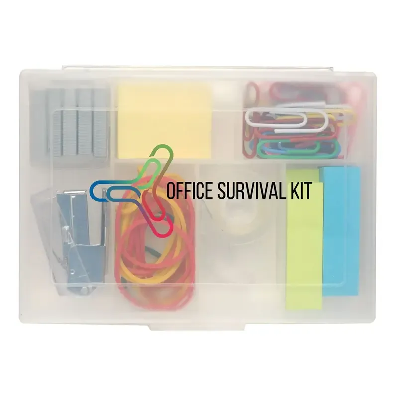 Use this divided translucent box with lid to keep your desk neat and tidy. It includes everything you need for your workspace, including a stapler, staples, paper clips, rubber bands, transparent tape, adhesive notes, and flags. Whether working from home or the office, you’ll want this small office supply kit nearby.