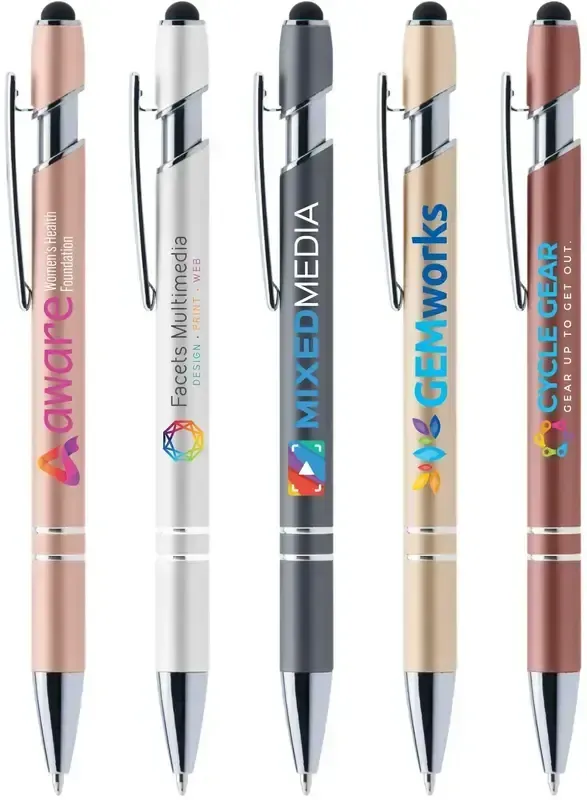 The Ellipse Softy Metallic is a stylish, premium pen available in a variety of metallic rubberized soft touch colors, with stylus that's perfect for touchscreens. Available in your choice of black or blue medium ballpoint ink. Your logo will look amazing in ColorJet, our vibrant, full-color inkjet imprint process.