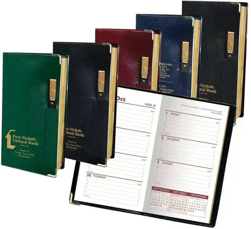 This 128 page week at a glance with gilded edges,metal corners, and a flat gold tip pen features one week on a two page spread in a one color print. This planner includes pages for important phone numbers and dates as well as advanced planning areas. Some other additional features include a metric conversion chart, time zone chart, popular 800 #'s list, area code map and important holidays page. It also features a full color 8 page U.S. Atlas with city maps.