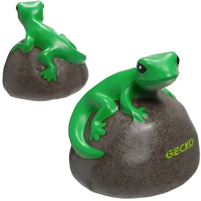 Gecko on rock shaped polyurethane stress reliever. Due to the texture and material of the item, the smaller text and detail in the logo will fill in or break up.