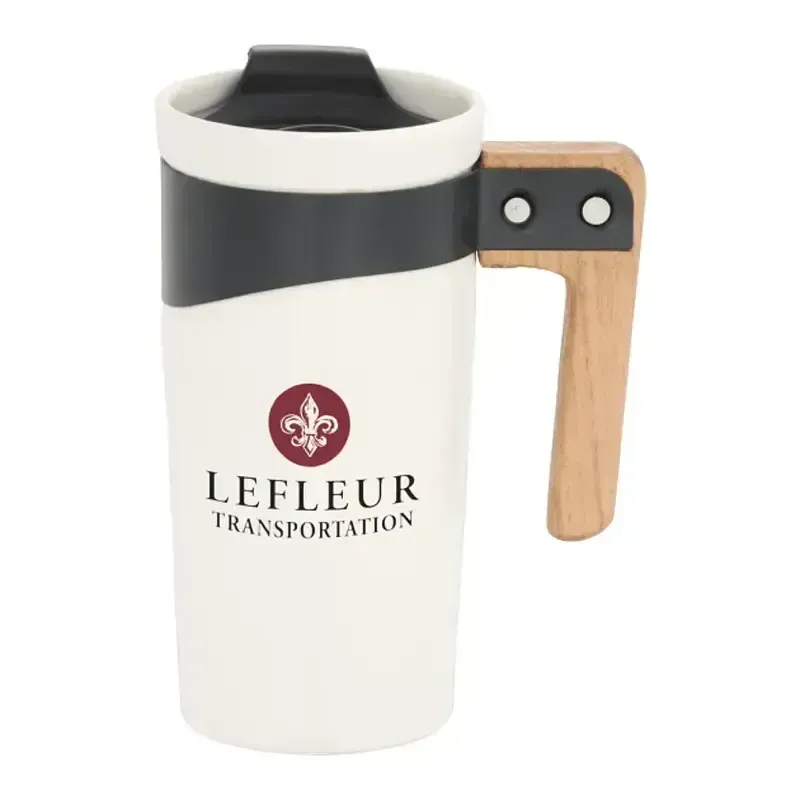 This 16oz ceramic mug features a trendy matte finish and a natural wooden handle with a black-coated stainless steel band. It includes a push-on lid with an easy-to-use slide-lock. The Grotto Ceramic Mug 16oz features up to three logo decoration areas, making it easy to showcase your brand.