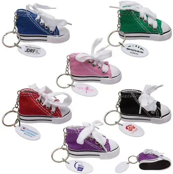 Each keytag features realistic details including stitched accents, metal eyelets, and real laces, giving it an authentic athletic look. A sturdy metal chain and split ring keep keys secure, while the attached oval tag provides space for your logo or message.