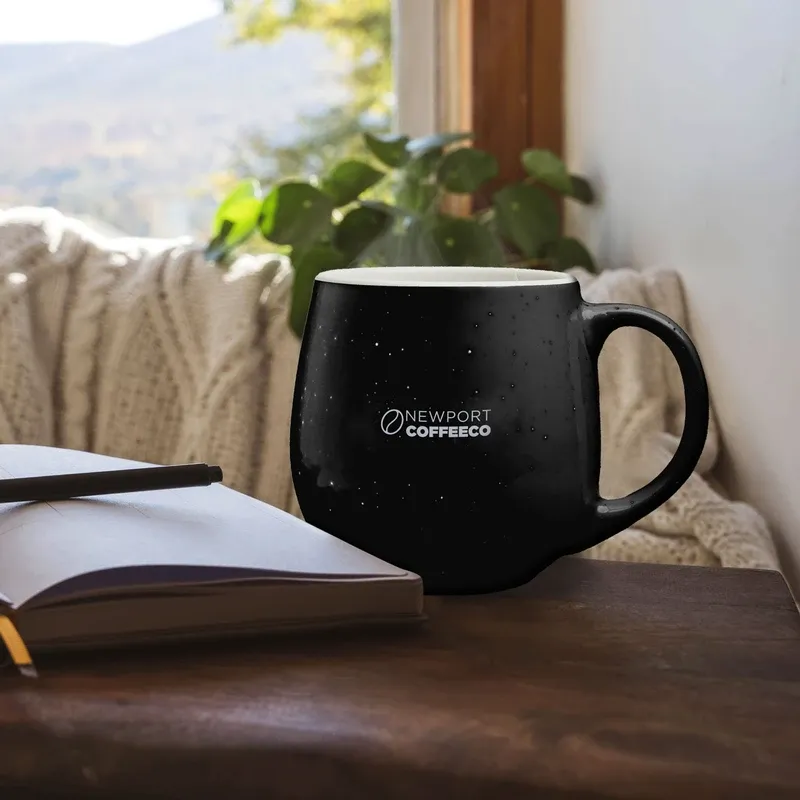 Designed with glamourous curves, for an ergonomic shape, the Kootenay mug is bound to become their new favorite. Delicate speckles add to the warm design of this bone china mug. The large "D" shaped handle provides comfort for hands of all shapes and sizes while the glossy exterior allows for any logo to pop off the surface ready to make positive impressions. Hand wash recommended. Not Recommended for Commercial Use.Please Note:Longer lead times will be required for Aqua Mark or HD Aqua Mark orders