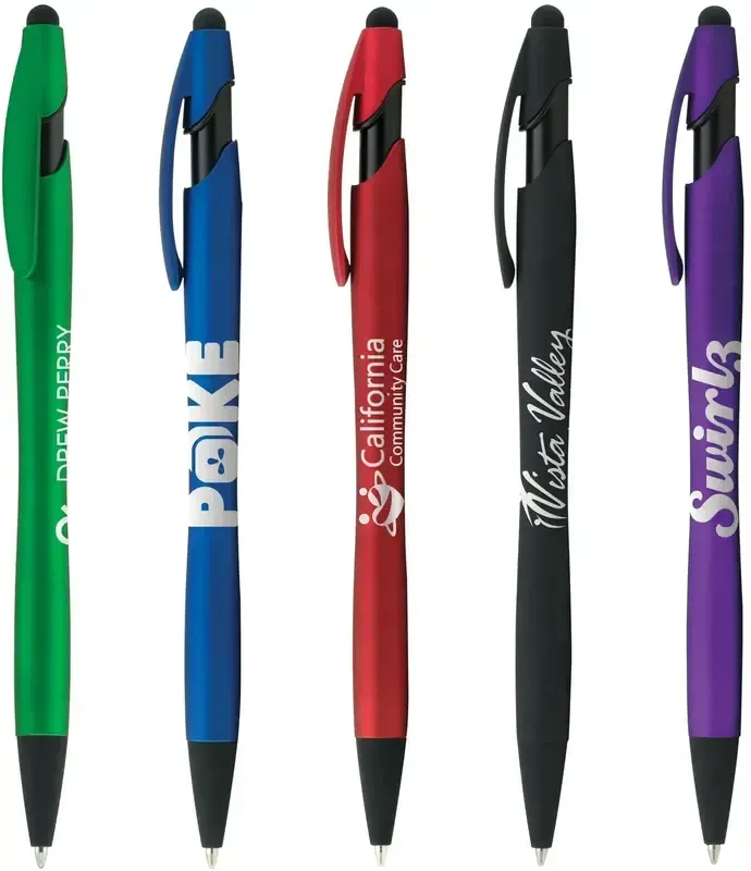 Once clients hold the La Jolla Softy Pen with Stylus, they'll want to use it every day. This sleek, elegant plastic pen uses trendy black trim and a soft-touch rubberized metallic finish that feels great and looks stunning. This medium black ballpoint pen also features a stylus at the top, making this the perfect 2-in-1 advertising gift.