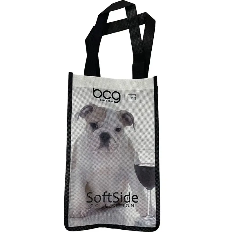 - Laminated Polypropylene nonwoven (7″ W x 12″ H x 3.5″ ) tote bag. Holds 2 bottles.