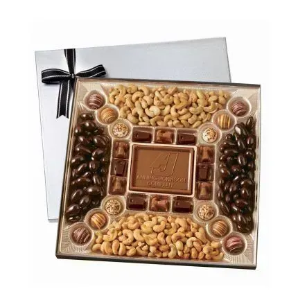 Great for holiday promotions and parties, this large chocolate confections gift box will satisfy any appetite! Start creating your unique gift by customizing the 4 oz. centerpiece in creamy milk or dark chocolate, then select up to 2 themed chocolate pieces and your choice of 2 confections. Available in gold or silver; the gift box is finished with 12 truffles radiating from the center. Over two pounds of treats perfect for sharing! Kosher certification available. Dimensions: 14 3/4" x 14 3/4".