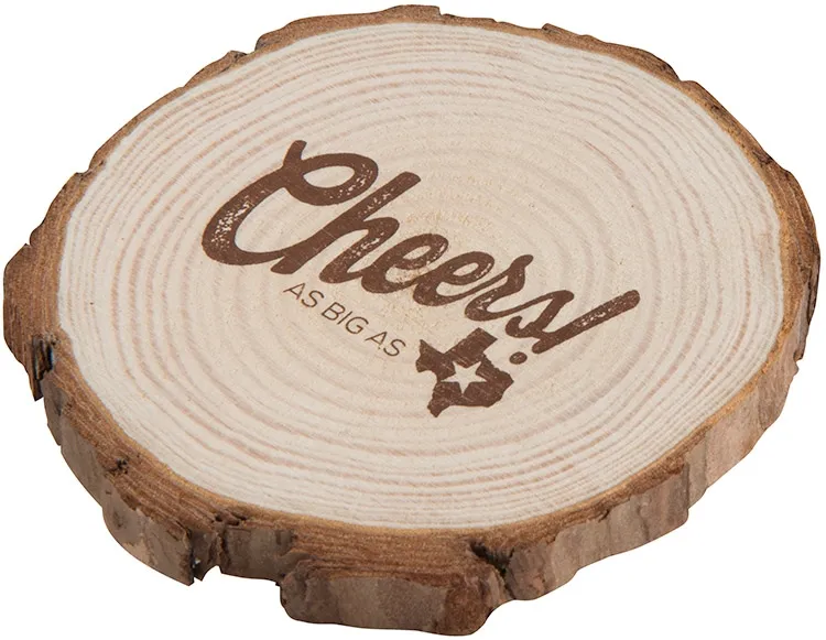 This handsome natural wood coaster adds a rustic touch to any desktop. A slim (.375") slice of actual wood. Looks great with either pad print or engraving. Due to the handmade nature of this natural wood product variations in size and color can be expected. This product is not intended for use by children or pets. It may present a choking hazard to children under 3 years of age.