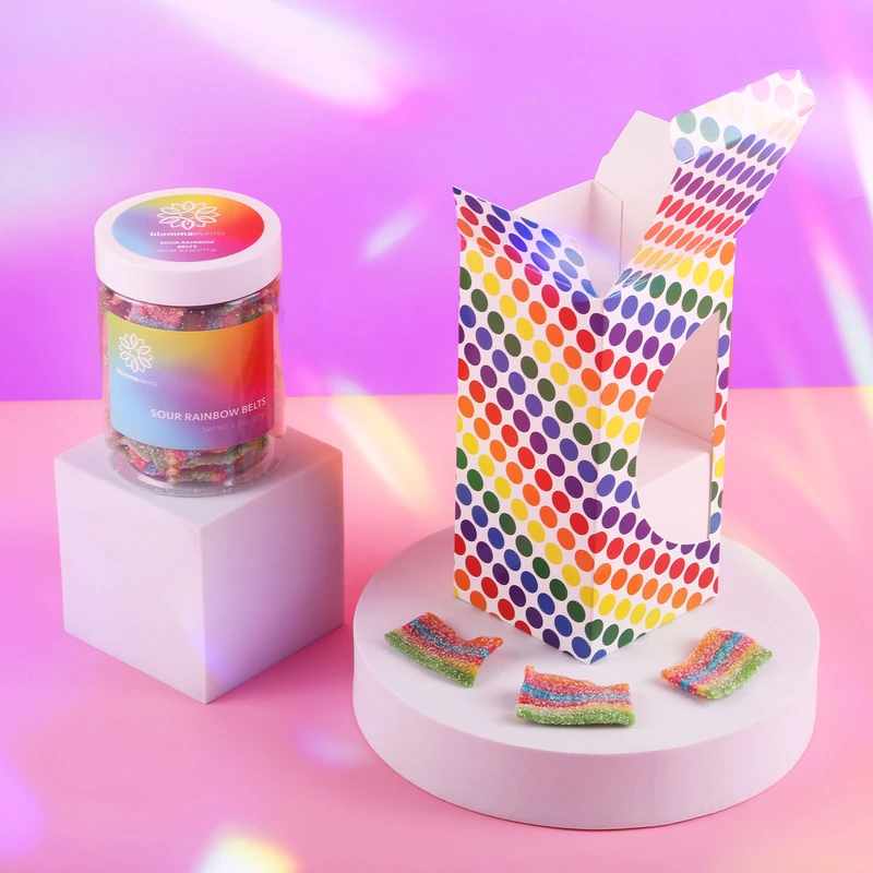 It’s a double rainbow! Sour Rainbow Belts are packaged sweetly inside our new Rainbow Sweetie Box. Gift everyone on your team a jar full of pride and show off your brand at the same time. Love always wins!Please Note:Ingredients: Sugar, Glucose Syrup, Wheat Flour, Water, Acidulant (Malic Acid), Fruit Juice Concentrate, Palm Oil, Sorbitol, Artificial Flavors, Monodiglyceride, Colors (FD&C Red No. 40, FD&C Blue 1, FD&C Yellow 5, FD&C Yellow 6, Titanium Dioxide)Allergens: Contains Gluten (Wheat) Product of: Turkey