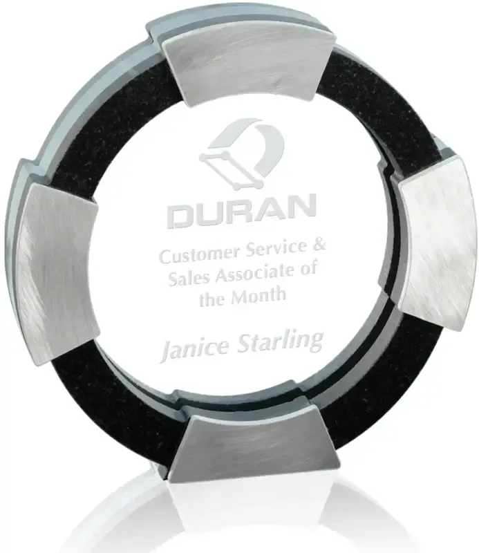 One of a versatile set of aquashaped awards, merging complementary starfire and black granite with decorative brushed aluminum accents. In the Madigan, notched granite circles are superimposed on both front and back of an identically notched central starfire circle. Front aluminum accents complete the piece.