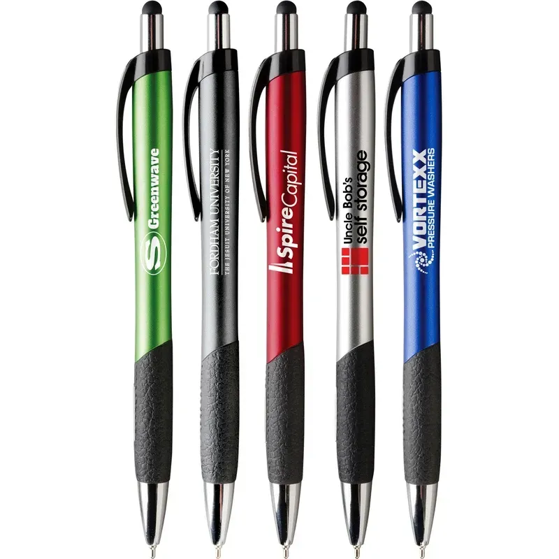 Metallic brights contrast with black and chromes accents for a bold statement. Ergonomic contoured shape with handy stylus tip. Seam stitching detail gives grip the look of leather. Supersmooth writing blue hybrid ink.