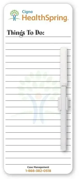 Grabbing this promotional product should be at the top of your list! Our magnetic write on/wipe off memo board is made from 12 pt. laminated paper and includes a stock Things to Do stock graphic design. Item comes with a wet erasable pen with clip that is shipped in bulk, and .012 magnets attached to the back. For individual packaging, contact Customer Service. Customize with a four color process imprint and hand out at your next marketing event.
