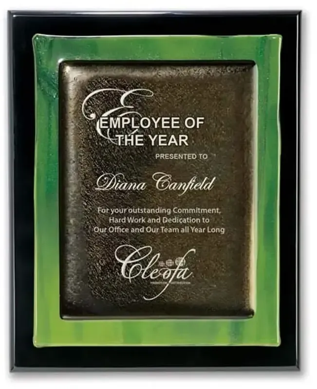 Metallic Fusion is formed using metallic gold and silver along with trendy new art glass colors to bring a fresh look to wall plaques. This collection shown here uses silver metallic centers with blue marble art glass mounted on walnut plaques with rolled edges.