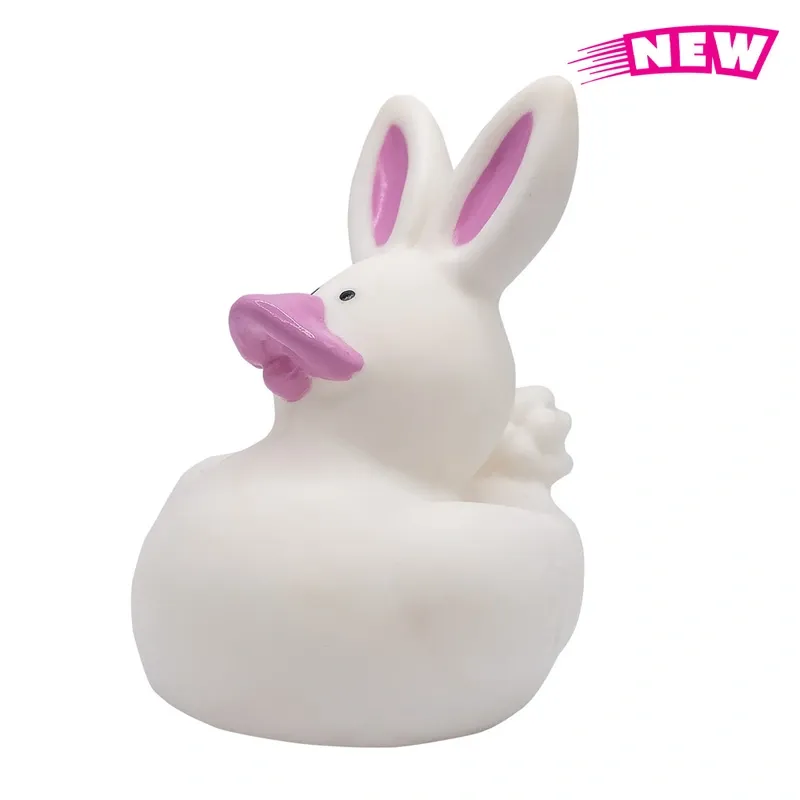 This bunny shaped rubber duck is a delightful addition to any promotional campaign or event. Measuring 2" x 2.75", it can be customized with your brand name, logo, or message. Perfect for trade shows, corporate giveaways, or as a whimsical desk accessory. This product is not intended for use by children or pets. It may present a choking hazard to children under 3 years of age.
