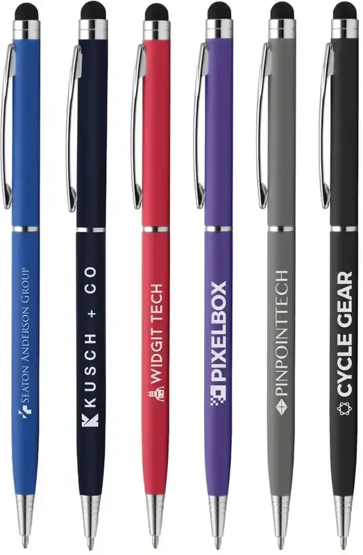 Sleek, soft and ultra slim, this twist-action ballpoint metal pen features the ever-popular rubberized soft-touch finish. Vibrant solid barrel colors, chrome accents and clip, the Minnelli Softy includes a stylus for use on touchscreen devices.