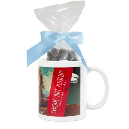Mug with dark chocolate almonds mug drop. 11oz full color mug. Dishwasher safe. Bow colors available in Black, Light Blue, Red and White.