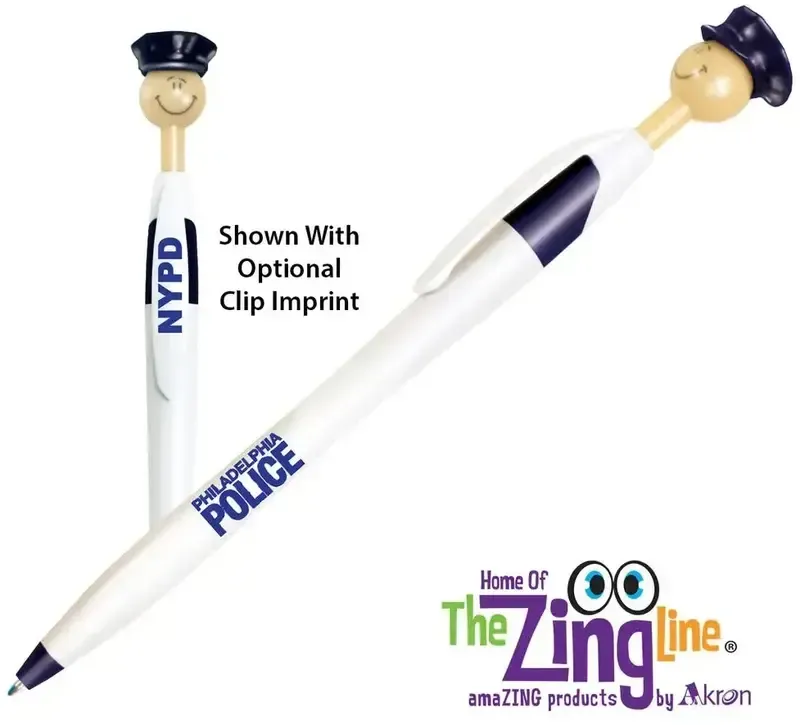Show appreciation for those who serve with the Officer Smilez Pen. Featuring bold blue trim and a detailed police hat accent, this design-protected pen combines personality with purpose for a memorable promotional piece.