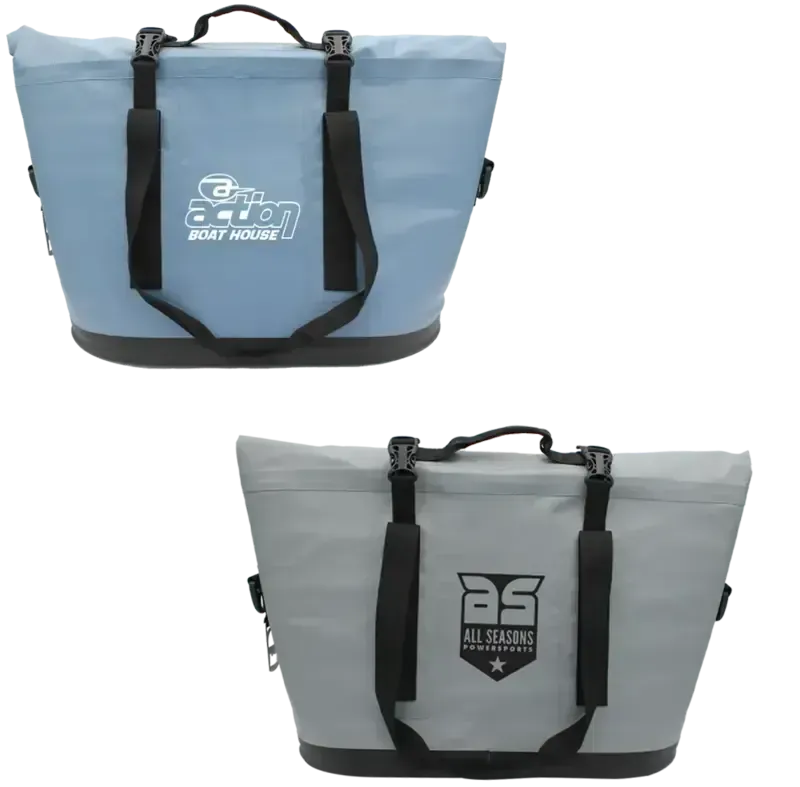 The exterior is constructed from durable 50C high density tarpaulin material for strength and weather resistance, while the 40C tarpaulin lining enhances leak protection and insulation. A reinforced black bottom guard made from 50C high density tarpaulin adds extra durability in high wear areas. The large zippered opening allows for easy loading and unloading, and the fold over flap secures with sturdy buckles to keep contents contained while traveling. A convenient bottle opener is attached to one side for added functionality.