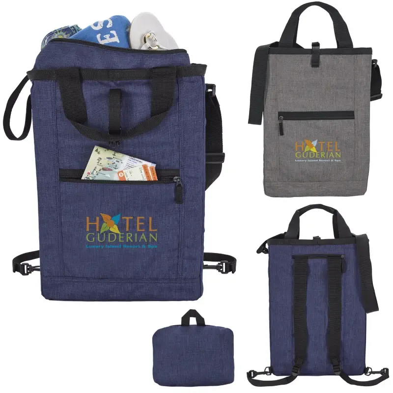 Carry this great combo bag either as a tote with its top handles or as a backpack using the adjustable shoulder straps that tuck away into a zippered pocket. When your adventure is over, use the interior mesh zippered pocket to fold the bag into itself for efficient storage.