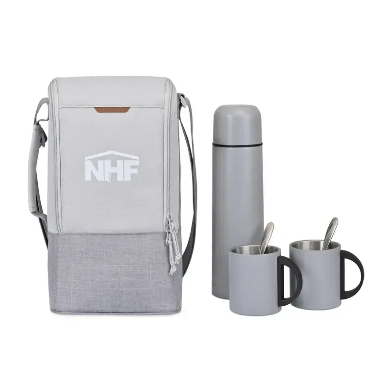 Featuring a color-block design and recycled material, this roomy and functional cooler has a timeless aesthetic. Constructed with recycled poly exterior. Dual zippers open to a large insulated and wipeable main compartment. Set includes (1) Stainless Steel Thermos, (2) Stainless Steel Mugs and (2) Spoons - coffee not included.