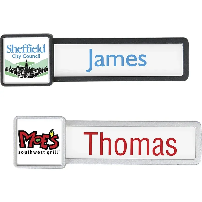 Available in black or silver, the Pittsburgh name badge is the perfect reusable option for showcasing a full color decal with polyurethane doming. The badge comes with a square at the end of the frame that showcases your logo with a full color domed decal. To personalize, pull off the decorated end, slide out the clear plastic protector, insert the printed insert, and reassemble. The badge comes with enough insert sheets to personalize the initial order and one extra insert sheet for turnover. Best of all, this badge comes with the magnet included!Please Note:Please note the printing process approximates a PMS match.Artwork shown is for presentation purposes only. Client must provide their own artwork.