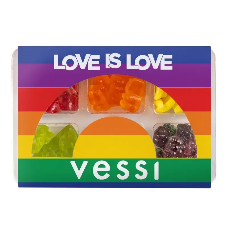 Pride rainbow die cut nested candy box features 6 cavities of assorted candy fills. Fills include cherry bites, orange bestie bears, silly bananas, green apple bestie bears, blue razz puffy puffs and gummy grapes. Custom die cut box features your logo/design on the box and is the perfect giveaway for all your Pride events.