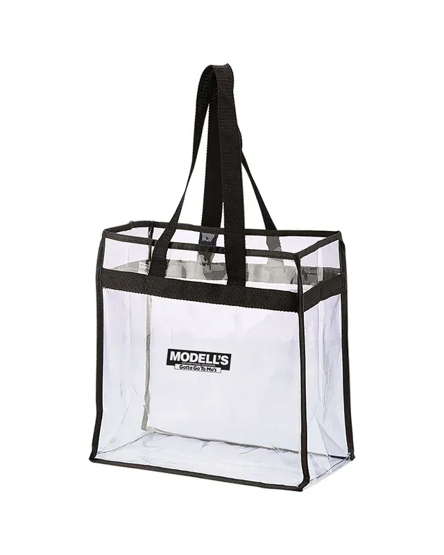 Clear 03 mm PVC ; Designed to meet NFL stadium restrictions; Also great for work place and school security; Tote bag with non-woven trim and open main compartment; 6" gusset; Recommended weight tolerance: 44 lbs; Product Size: 12" w x 12" h x 6" d;