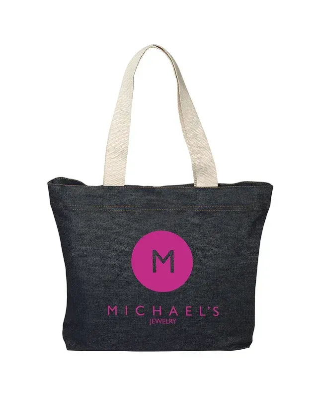 11 oz., 100% Cotton Denim; Tote with cotton web handles and magnet button closure; Sensible and stylish for everyday use; 23"l web carry handles; Hand wash only; Product Size: 13.5" w x 17.25" h x 3.5" d;