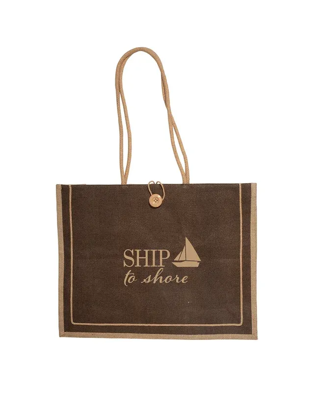 Eco-Responsible large open tote bag made from laminated Jute, a natural vegetable fiber, colored with Azo-free dye In addition, when Jute fiber is made into fabric there is little waste, and most of that waste can be used for other purposes such as insulation and road building ; Reusable and compostable; Features 25l Cotton rope handles and button loop closure; Recommended weight tolerance: 7 lbs; Product Size: 18" w x 14" h x 5.5" d;
