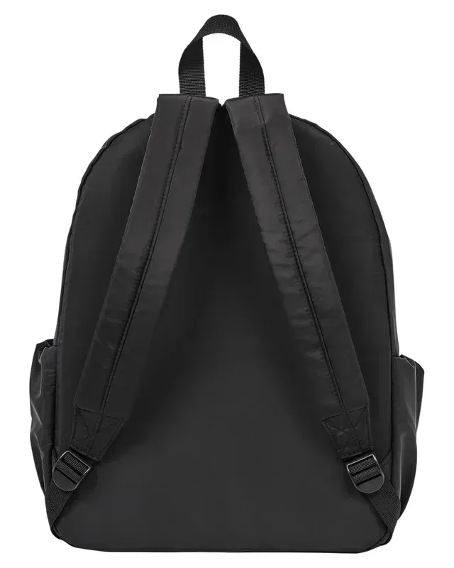 70D recycled polyester with knit backing; This backpack is the ultimate blend of fashion and functionality, allowing you to express your individuality while staying organized and on-trend; Large front zippered pocket; two self-fabric side bottle pockets; Interior features padded laptop pocket; Padded back; self-fabric padded adjustable shoulder straps; Product size: 13.4" w x 7.5" d x 16.1" h;