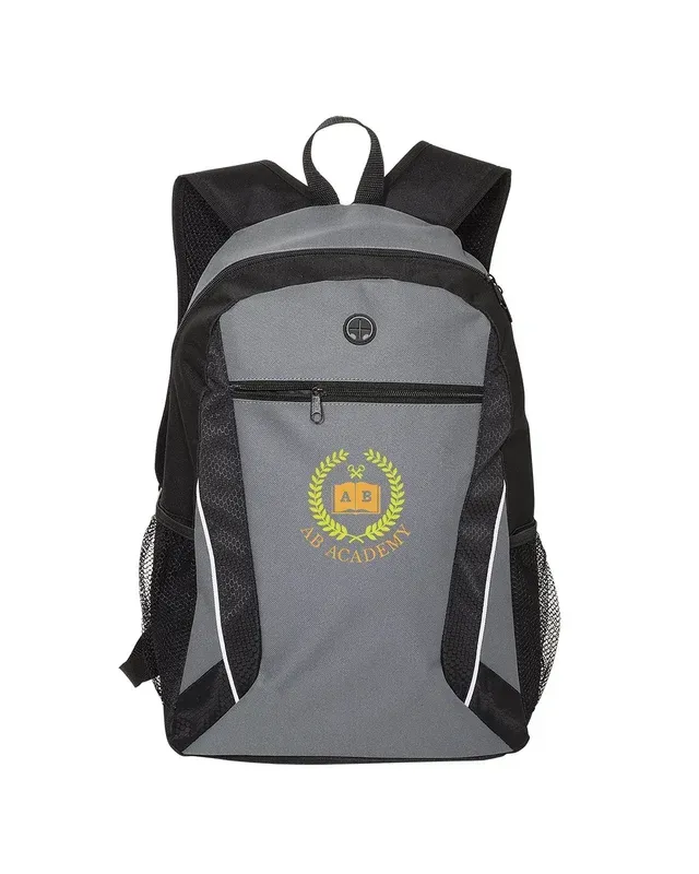 600D & 420D Polyester with PVC Backing (210D Lining); Features main and front zipper compartments; Rubber earphone outlet; Padded back panel and shoulder straps; Two side mesh pockets; Recommended weight tolerance: 33 lbs; Product Size: 12" w x 18" h x 6" d;