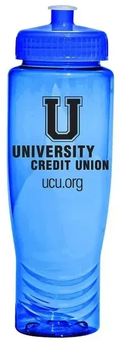 Translucent plastic bottle, 28 oz Polyfresh (TM). Recyclable and BPA free. Wide mouth perfect for ice cubes. Push/pull twist-on cap free assembly. Same color, second side or wrap imprint at no additional charge. Ounce gauge molded into back of bottle. Size: 9 1/2 H x 3 Diameter.
