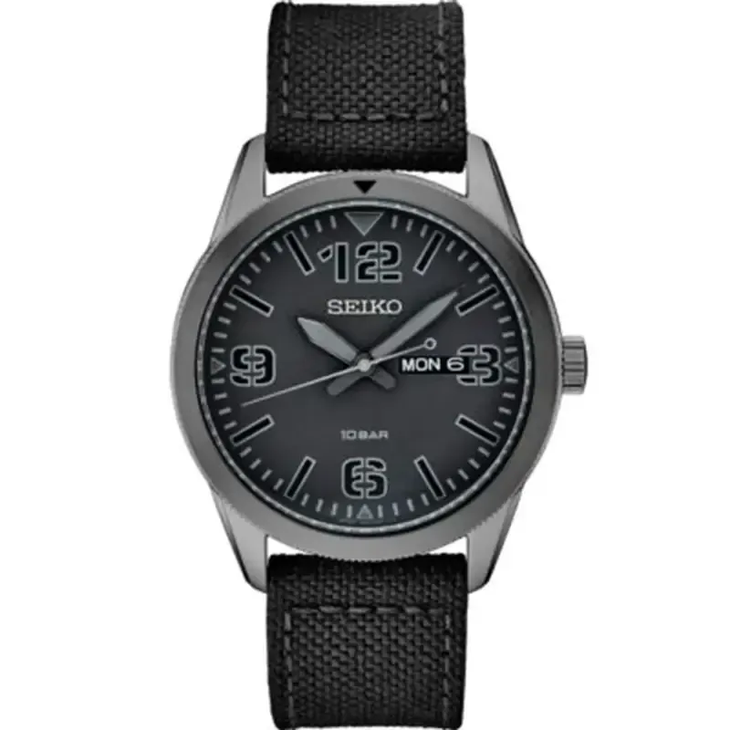 Black dial with Arabic numerals, Day/date calendar, LumiBrite hands & markers, Case diameter: 43.6mm, Stainless steel case in black ion finish, Black nylon strap, Water-resistant to 10 bar, 100 meters (330 feet)