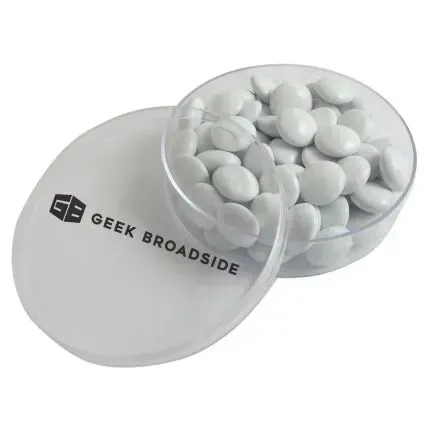Show customers that you have good taste by handing out this pocket-sized gift! Measuring 2 7/8", this small round clear acrylic is filled with 1.5 oz. of delectable chocolate buttons, which are available in assorted colors or choose one to match your brand. Imprinted with a one color logo or company name, it makes the perfect promotional party favor, goody bag stuffer, holiday gift or other fun handout! Sweeten the deal with this tasty promoter!
