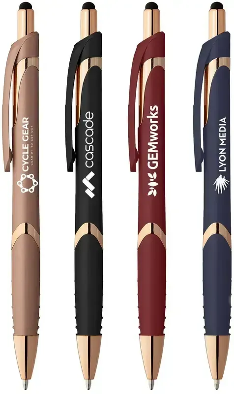 The Solana Softy Rose Gold with Stylus features super-stylish rose gold accents that really shine next to luxurious soft-touch barrel colors. This click-action plastic retractable ballpoint pen features a soft, rubberized barrel with a matching grip, plus capacitive stylus for use with all your digital touchscreen devices. Customize with a 1-color silkscreen imprint to get your logo and advertising message across at networking events, trade shows, conferences and other marketing opportunities. This stylish pen is an ideal way to promote your brand and delight your fans!