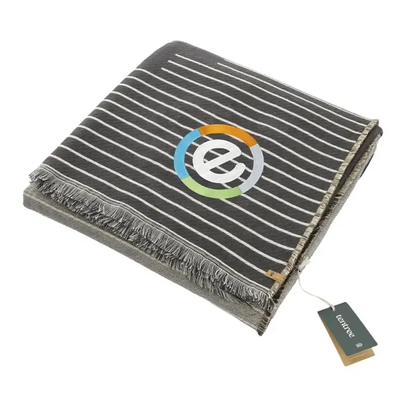 The tentree Organic Cotton Peaks Woven Blanket - cozy up in something good for the planet. This eco-friendly blanket is made from 100% organic cotton and features a striped side and a geometric peaks shaped side. Unfolded dimensions of this blanket are 86" x 55". Folded dimensions are 14" x 14". Free run charges on embroidery up to 10,000 stitches. Through a partnership with 1% For The Planet, one percent of sales of all EcoSmart products are donated to nonprofits dedicated to protecting the planet.