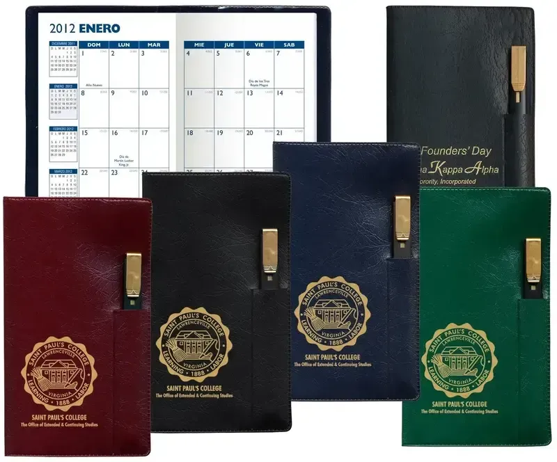 This Executive Spanish Monthly planner with a flat black gold tip pen features 32 pages and shows one Month on a two page spread. The planner inside is printed in blue as shown to the left and runs 14 months from December through January. It includes pages for important phone numbers and dates as well as advance planning areas. Also included are metric conversion charts, a time zone map, area code table as well as an important holidays page.